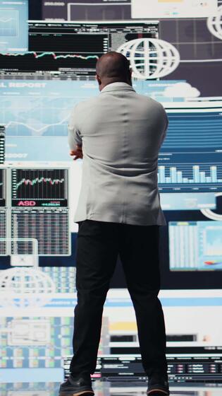 Vertical African american guy reflecting on annual financial reports for new development, reviewing the complexity of performance analysis with a focus on productivity and forecasting, AI tools. Camera A. Pro Video