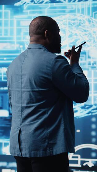 Vertical African american IT specialist calling a technician on his smartphone, talking about automation via neural networks systems. Businessman discuss about coding and data processing. Camera A. Pro Video