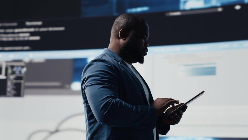 African american coder expert immersing in software development for a high tech work environment, focused on laptop screen. Engineer enjoying coding life and IT cloud computing. Camera B. Pro Video