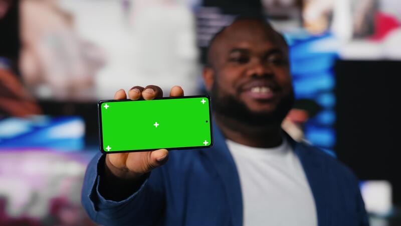 Black socials user shows a smartphone with isolated screen, digital system of networks and applications on dashboard. Highlighting the integration of AI and fintech. Multitasking. Camera B. Pro Video