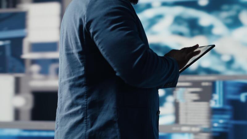 In a futuristic digital workspace, black developer programming software and explores code snippets. Tech professional embodies innovation, cybersecurity, automation and development. Camera B. Pro Video