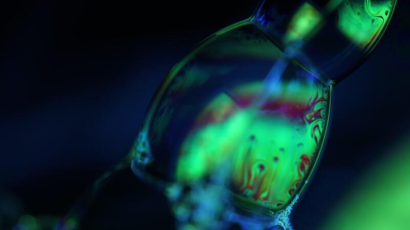 Reflections of liquid in macro, green liquid surface, bubbles in macro, connection of bubbles in macro, cell from liquid, dark background, glossy surface Free Video