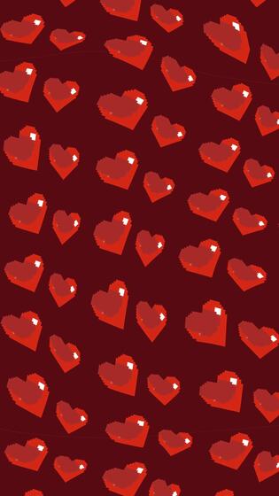 Pixelated bright red hearts scrolling upward on a dark red maroon background with vertical format and wobble effect. The retro 8-bit style creates a nostalgic, playful, and romantic visual effect. Pro Video