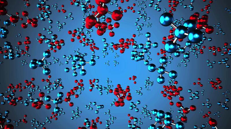 Visualization of molecular structures in blue and red colors showcasing dynamic interactions in a microscopic environment Pro Video