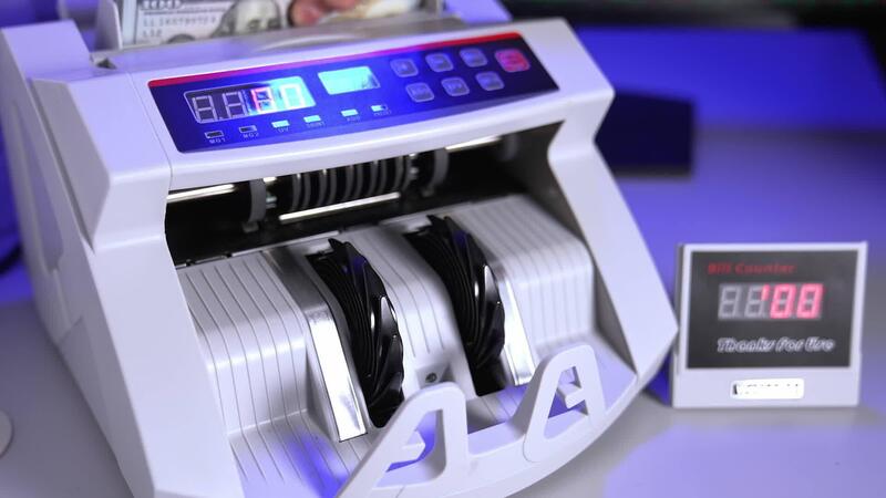 Modern electronic machine. Machine counter automatically calculates a large amount of dollar banknotes. Top view. Business accounting. Pro Video