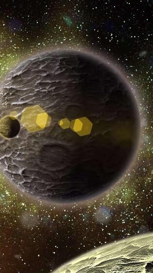 A dark planet with a rocky, textured surface dotted with meteorite craters orbits in space with a companion planet. Pro Video