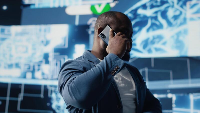 Black entrepreneur using mobile phone call to interact with people, shares insight on cybernetic platforms and AI interfaces. Machine learning and predictive analytics for growth. Camera A. Pro Video