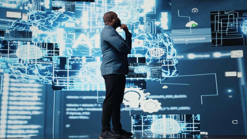 Black male specialist engaged in AI research interacting with data structures or platforms and smart technology systems. Studies deep learning, cloud computing and predictive analytics. Camera A. Pro Video