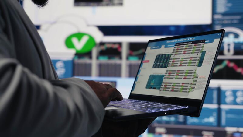 Black business manager using his laptop to examine fintech insight, reading big data and KPI metrics in order to build a new vision. Leadership and management skills. Close up. Camera B. Pro Video