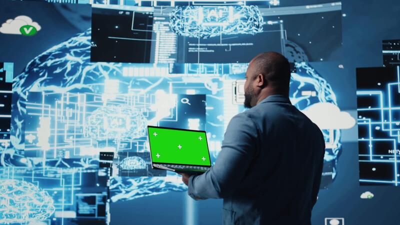 Modern black person in digital space uses isolated display with AI tools, representing artificial intelligence data structures and intelligent systems. Innovation and cybernetics for science. Camera A. Pro Video