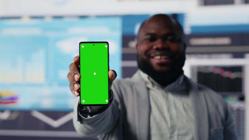 African american administrator uses copy space on phone and examines dashboards, ensuring analytics and performance metrics with KPI projections. Management decision for innovation. Camera B. Pro Video