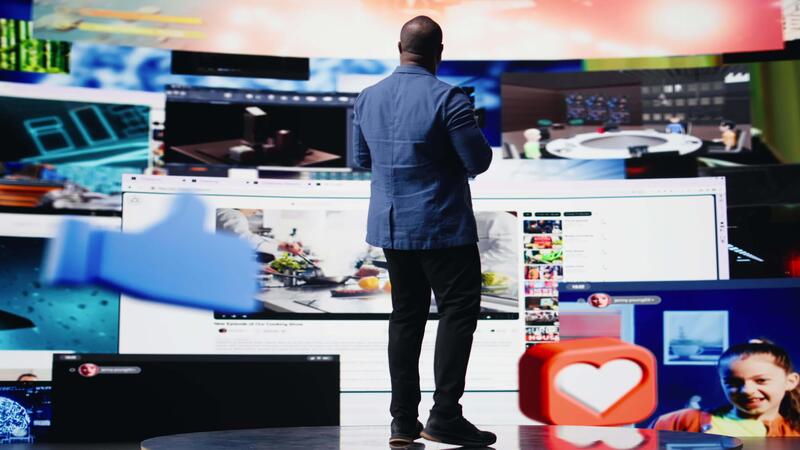 African American user emphasizing visual concept of online communication, connecting to web platforms and apps. Mobile technology surrounded by social network icons in digital space. Camera A. Pro Video