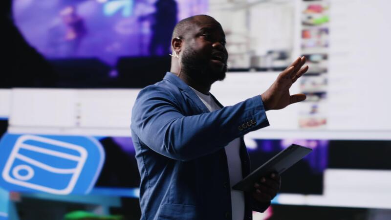 Black presenter hosting conference on stage surrounded by media visuals, symbolizing global convention with live audience to discuss about online trends and mobile apps. Public event. Camera B. Pro Video