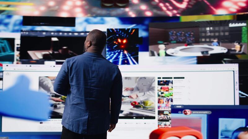 African american person connected in a world of platforms and digital content, future of social engagement, AI driven networks and interactive web experiences. User interface. Camera A. Pro Video