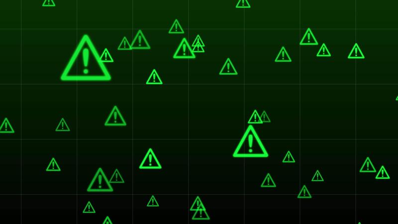 Glowing green caution and warning triangles scattered across a dark, grid-patterned background, representing alerts, cybersecurity threats, risks, and digital system errors.Animated Green Warning Tria Free Video
