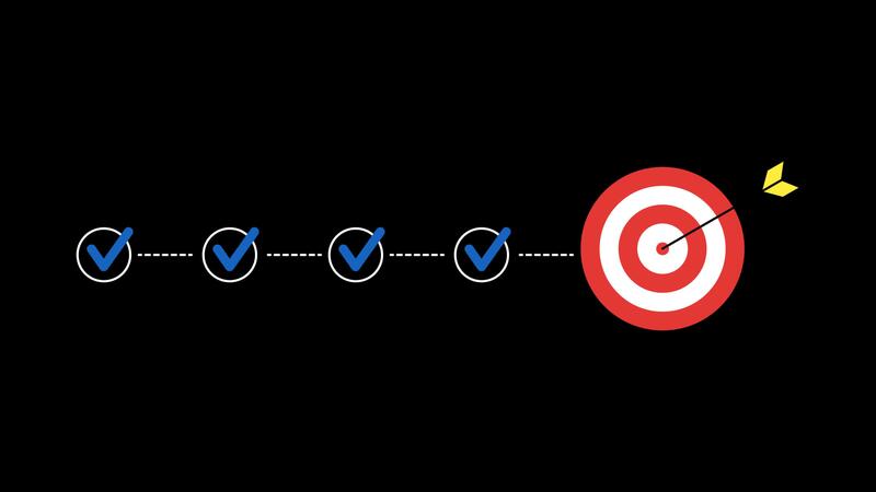 Animated checklist steps with blue checkmarks pointing to a red target hit by an arrow. Ideal for goal setting, business strategy, planning, and visualizing success. Alpha channel Free Video