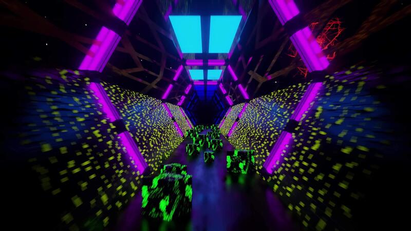 Neon hexagonal tunnel, green cubes, pixel particle walls loop. Pro Video