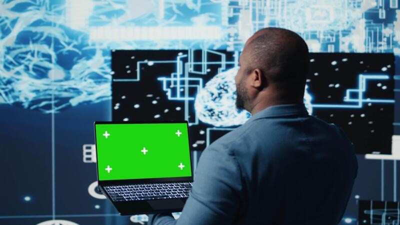Black male engineer showing laptop with chroma key display next to predictive analytics immersed in AI brain development and deep learning. High tech cybernetics algorithms. Camera A. Pro Video