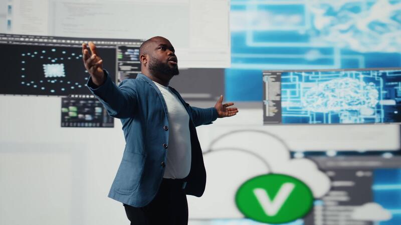 Black engineer explores algorithm design and binary code with high tech AI tools, programming code for automation and innovation. Connection to IT systems and the futuristic world. Camera A. Pro Video