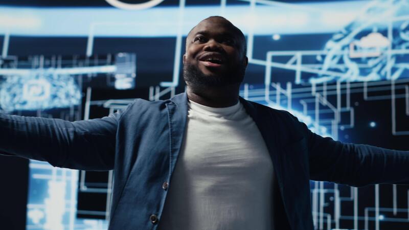 Black IT specialist working in cyberspace and AI brain tools for deep learning and neural networks systems, representing algorithmic thinking development. Big data visualization. Camera B. Pro Video