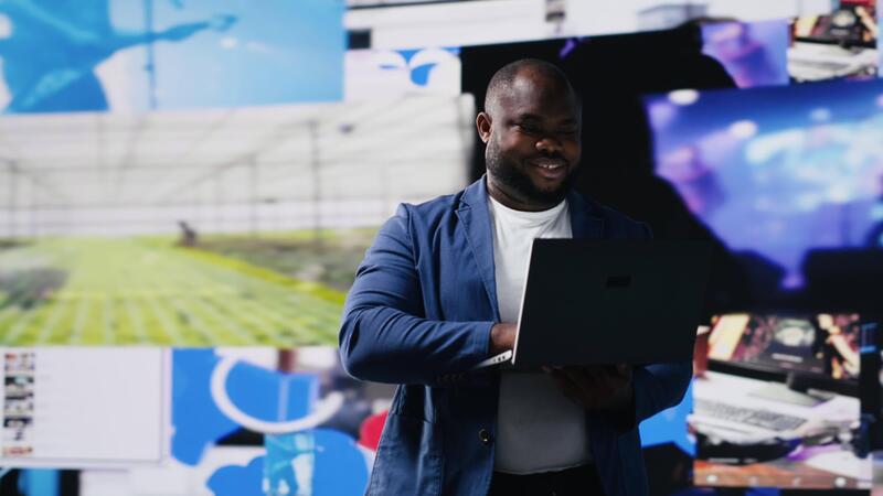 Black social media manager browsing high tech environment with app interfaces, infographics and social networking feeds. Big data on social media platforms, multimedia. Camera B. Pro Video