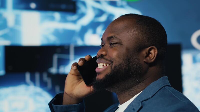 Tech entrepreneur talking on a phone call in an AI environment, representing predictive algorithms and deep learning platforms. Working on automation and intelligent cybernetics. Camera B. Pro Video