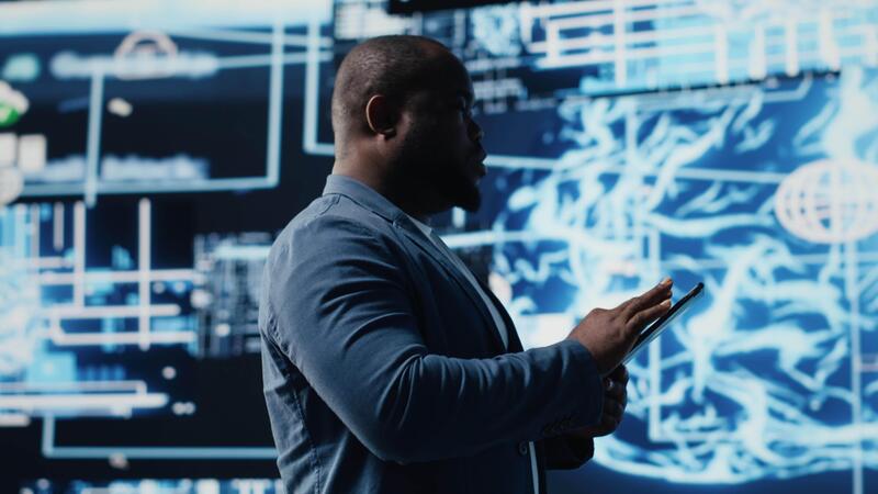 Black male IT engineer examining digital AI brain interface on dashboard, symbolizing neural networks, science and algorithmic thinking. Cybernetics for high tech machine learning. Camera B. Pro Video