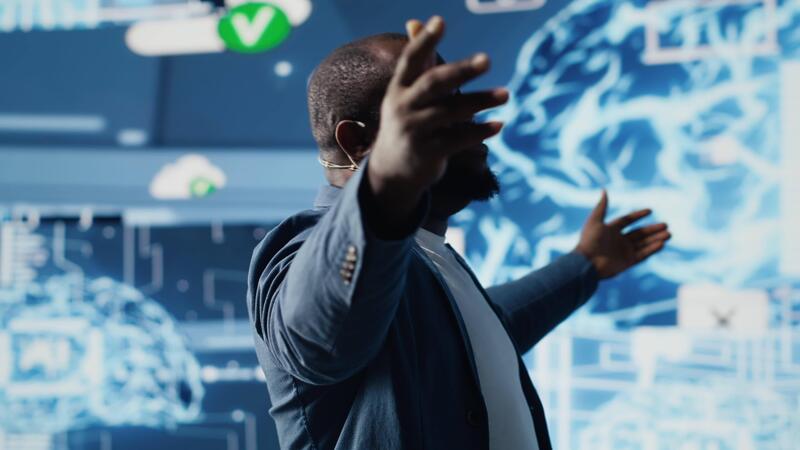 Black public speaker engineer presenting AI neural networks to the audience, discussing about the importance of automation and predictive analytics. Artificial intelligence convention. Camera B. Pro Video