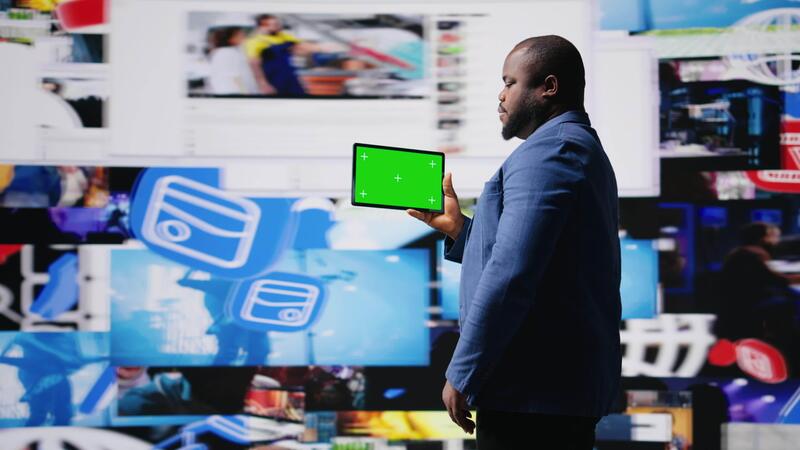 Social media environment with a person using copy space device, surrounded by tech visuals, infographics and digital apps. Emphasizing communication and web entertainment. Camera A. Pro Video