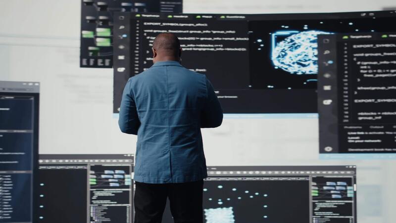 African american coder expert immersing in software development for a high tech work environment, focused on laptop screen. Engineer enjoying coding life and IT cloud computing. Camera A. Pro Video