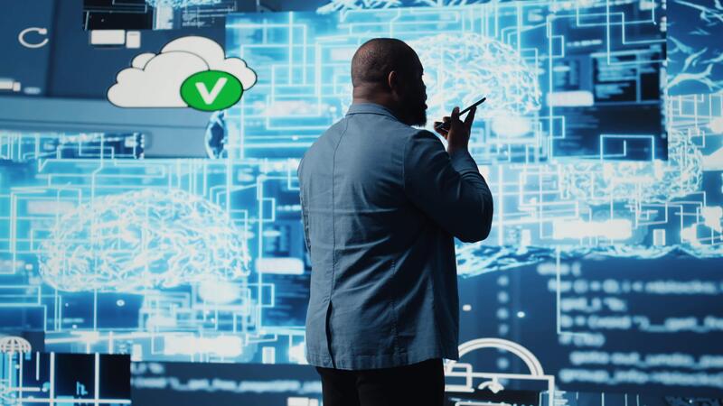 African american IT specialist calling a technician on his smartphone, talking about automation via neural networks systems. Businessman discuss about coding and data processing. Camera A. Pro Video