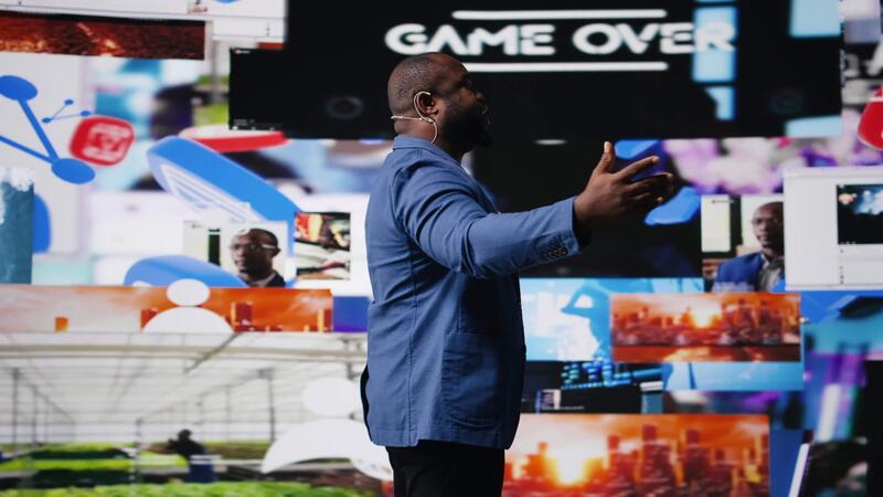 African american host at digital event engages the audience with insights on social media trends, e commerce and engagement using apps or web platforms. Real time data visualization. Camera A. Pro Video
