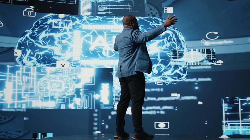 Black public speaker engineer presenting AI neural networks to the audience, discussing about the importance of automation and predictive analytics. Artificial intelligence convention. Camera A. Pro Video