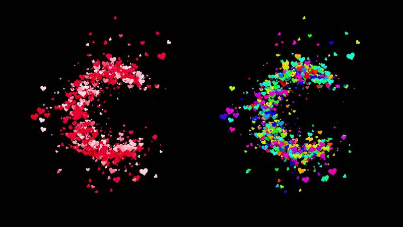 3D animation set of two swirling heart streams. Red on the left and multicolored on the right. They rotate energetically and gradually transform into the letter C. File includes an Alpha Channel. Pro Video