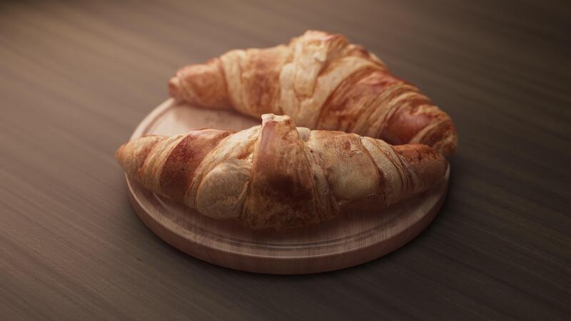 Looping animation around a composition of two croissants lying on a wooden board. Loop motion. Defocus. Close-up. Pro Video