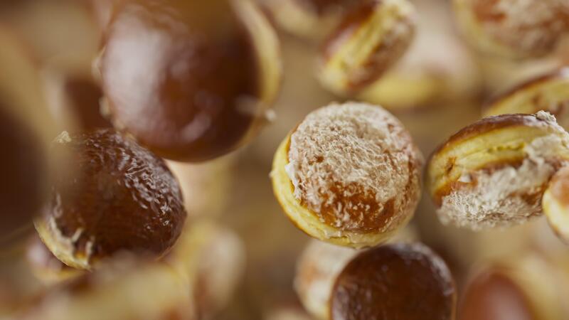 Animation of a group of donuts. Many donuts slowly rotate in the background in space. Horizontal composition. Defocus. Close-up. Pro Video