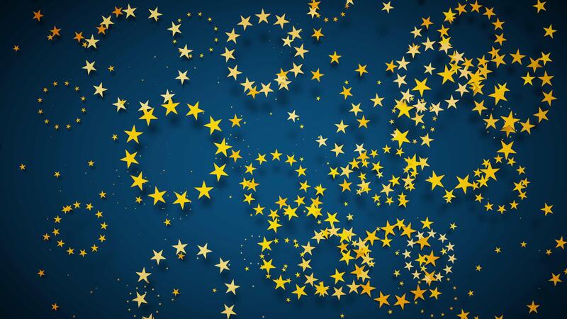 Looped 3D animation of European Union stars on a blue background. Stars rotate in circular motion, creating a dynamic pattern. Suitable for EU themes, politics, integration, and backgrounds. Pro Video