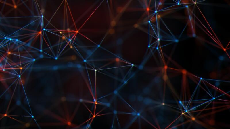 Abstract technical plexus background with glowing red and blue connecting lines and dots. Concept of connecting to a digital data network. This is a modern smooth looping. Pro Video