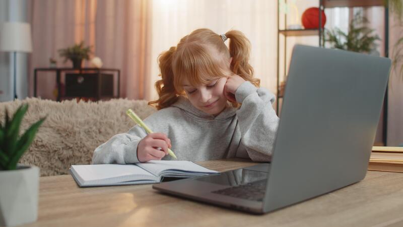 Tired young girl doing homework at table with laptop writing in notebook and showing lazy expression Pro Video