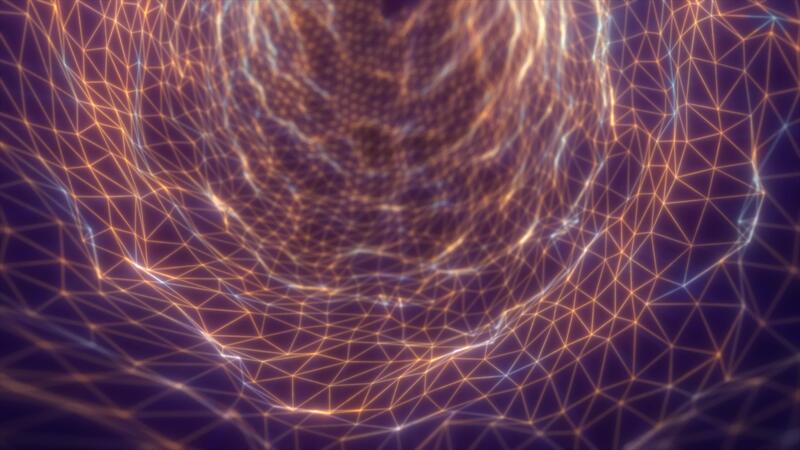 Abstract glowing tunnel of triangular wireframes in warm golden tones, forming a complex digital vortex Free Video