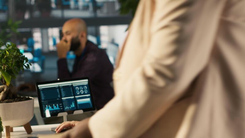 Office clerk at computer desk reading documentation files, solving tasks. Staff member analyzing data on paperwork documents, interpreting statistical information, camera A Pro Video