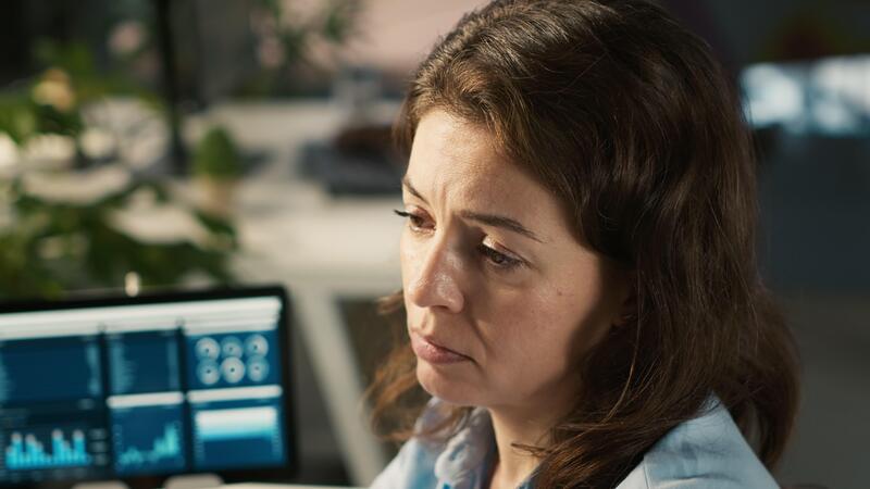 Worker in office falling asleep at computer desk while analyzing business performance metrics. Exhausted woman dozing off while reviewing financial charts at work, camera A Pro Video