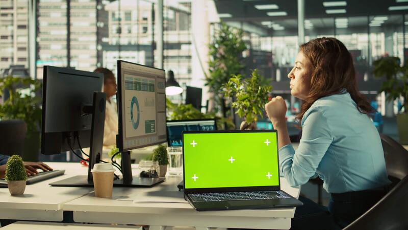 Green screen laptop on office desk next to employee editing documents on computer. Mockup notebook next to worker analyzing data charts, interpreting statistical information, camera B Pro Video