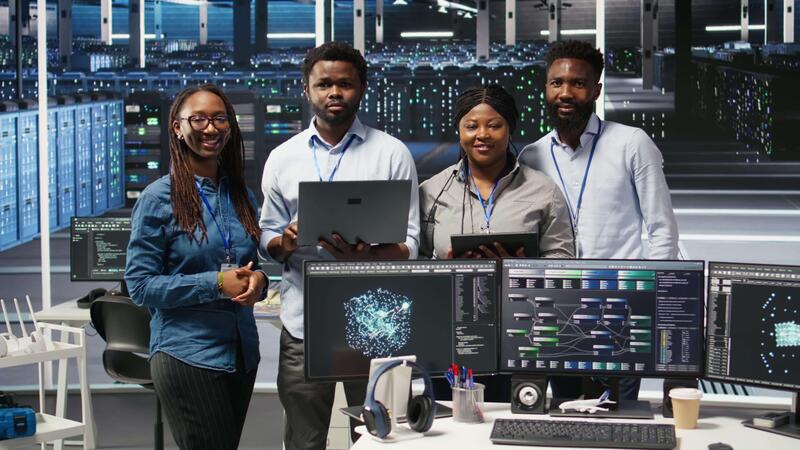 Portrait of smiling data center technicians analyzing infrastructure issues using node tree tools. Happy server hub specialists review AI visualization insights to optimize system health, camera A Pro Video