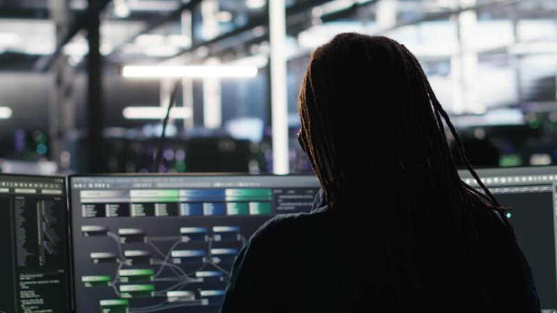 Data center engineer implements AI virtualization frameworks to optimize server clusters. Server hub IT professional doing artificial intelligence predictive analysis, camera B Pro Video