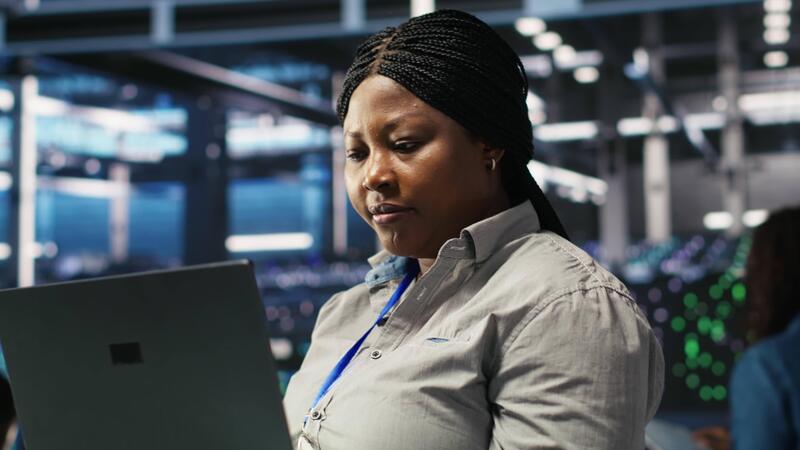 Vertical Cheerful data center employee using node tree software to analyze datasets. Upbeat server facility engineer using visual programming to improve infrastructure performance, camera B Pro Video