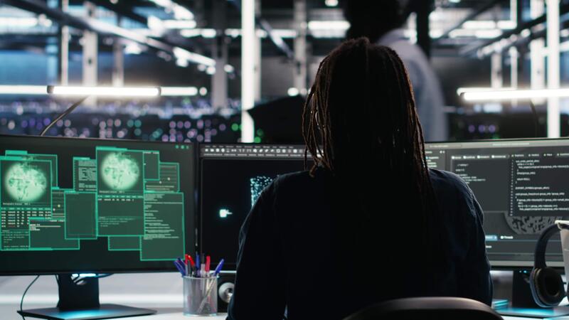 Vertical Panicked engineer in AI server facility reacts to hacking incident involving theft of sensitive data. Data center employee alarmed by computer virus triggered by security systems, camera B Pro Video