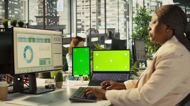 Isolated screen laptop and tablet on office desk next to employee editing documents on computer. Chroma key devices next to worker analyzing data charts, interpreting statistical information, camera B Pro Video