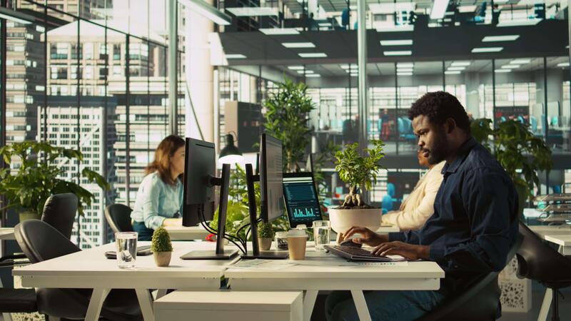 Employee in office leaving desk to present revenue figures on tablet. Accountant finishing project task of comparing company statistical numbers on device, going to present data, camera B Pro Video