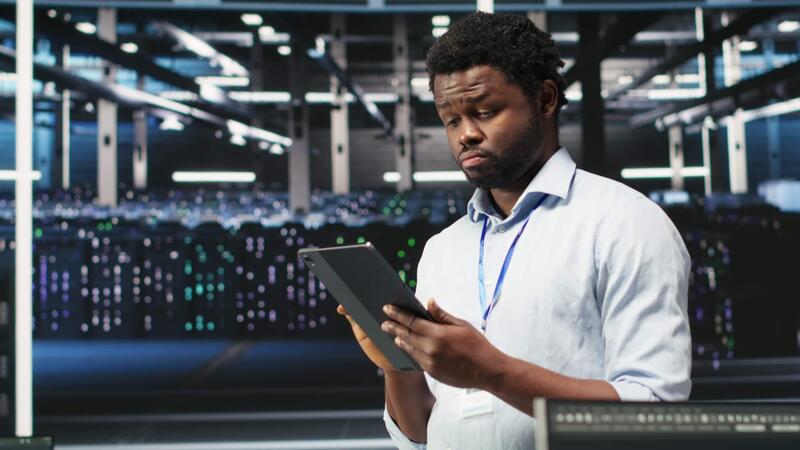 Data center engineer using tablet to interpret data analytics graphs. Server room worker using artificial intelligence displaying system performance predictive metrics, camera B Pro Video